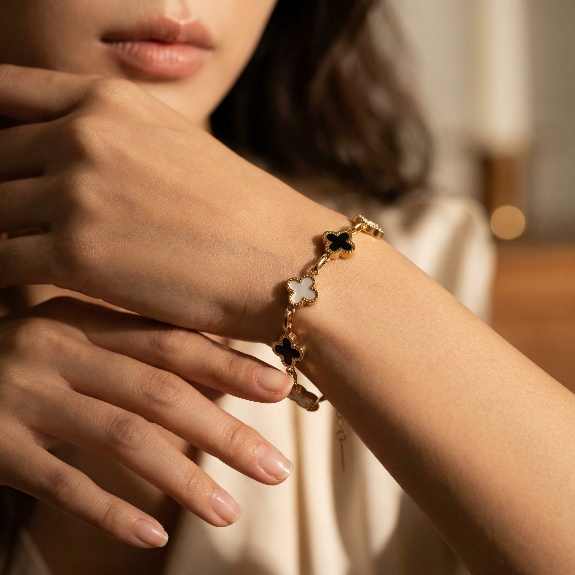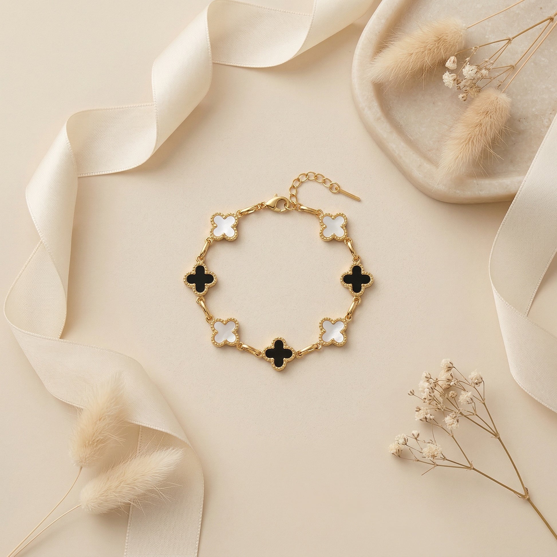 Discover striking contrast in the Elise Black & Ivory Bracelet. This sophisticated piece combines the drama of black with the elegance of ivory tones, creating a captivating visual harmony. Crafted from premium stainless steel with 22k gold plating, it's a modern masterpiece that defies convention.