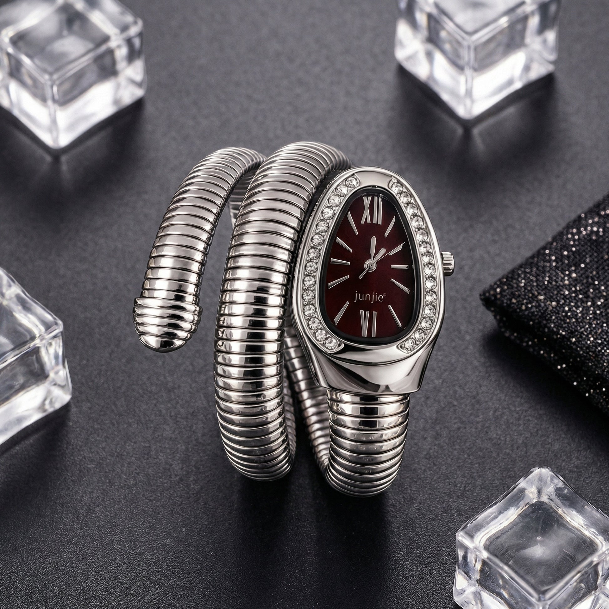 The Korean Luxe Wrap Silver Watch – Ruby Dial features a high-shine silver wrap bracelet and a deep ruby red dial framed with crystal detailing. Designed to stand out, this sculpted silhouette blends modern glam with K-fashion edge.