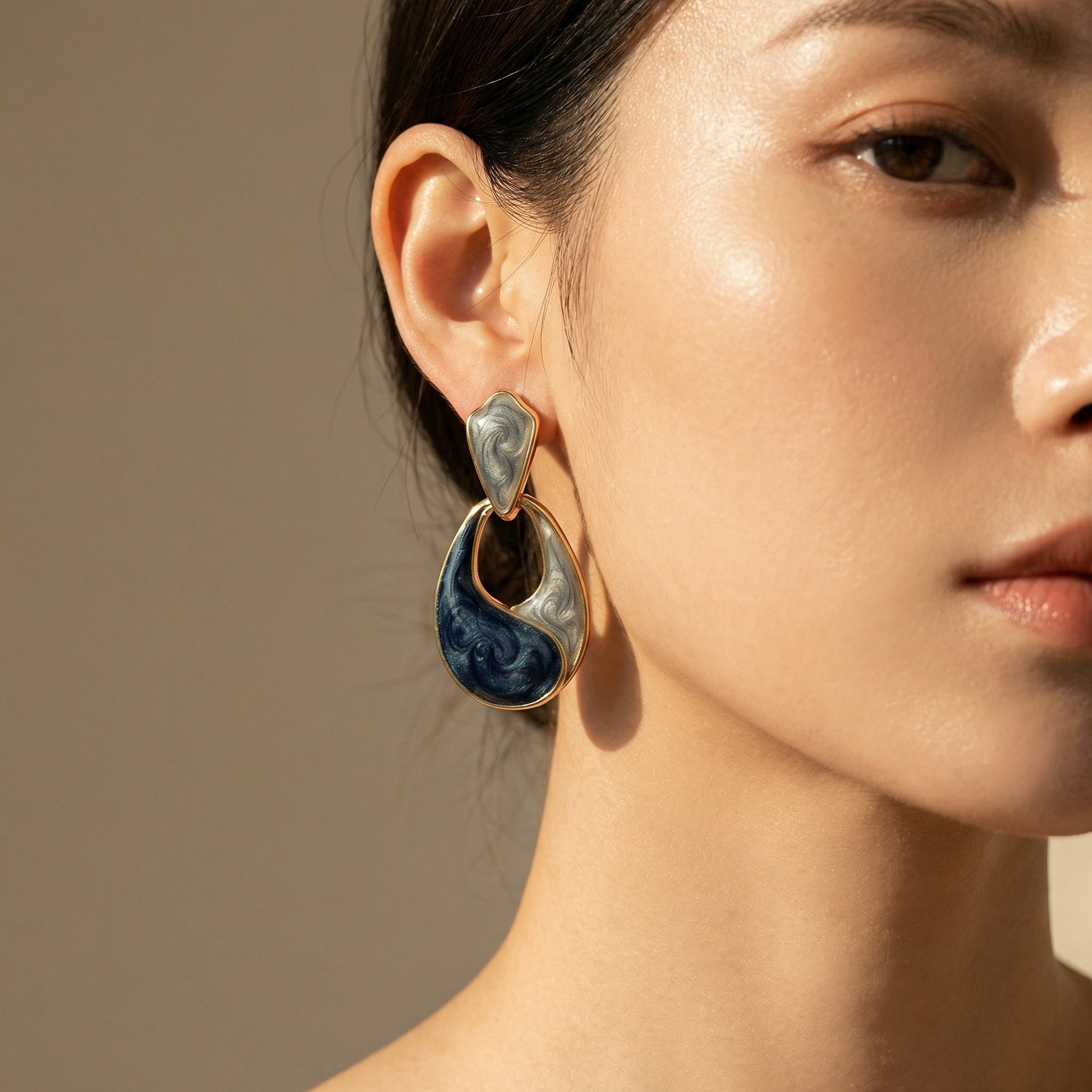 A bold fusion of navy and grey marble swirls framed in luxe gold. These artistic teardrop earrings bring a modern, statement vibe while keeping it effortlessly elegant. These earrings are ideal for enhancing both daytime and evening ensembles.